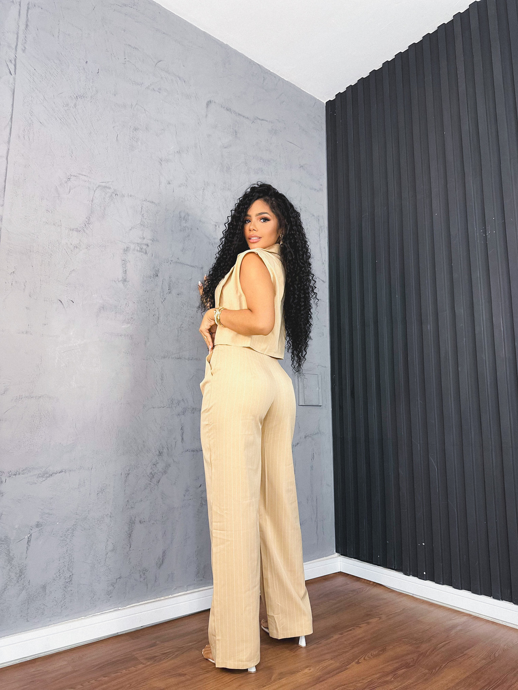 Design Clássico e Moderno O conjunto é composto por uma blusa e uma calça que apresentam um padrão de risca de giz, trazendo um toque atemporal ao seu guarda-roupa. O tom bege é ideal para combinações versáteis, permitindo que você crie looks deslumbrantes.